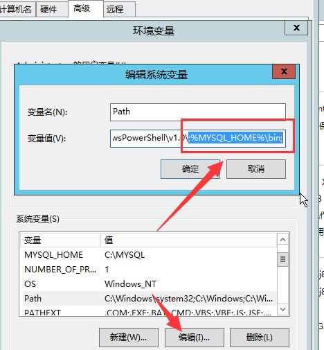 在原有的path变量上,点击编辑:添加这样一句话:;%MYSQL_HOME%\bin;